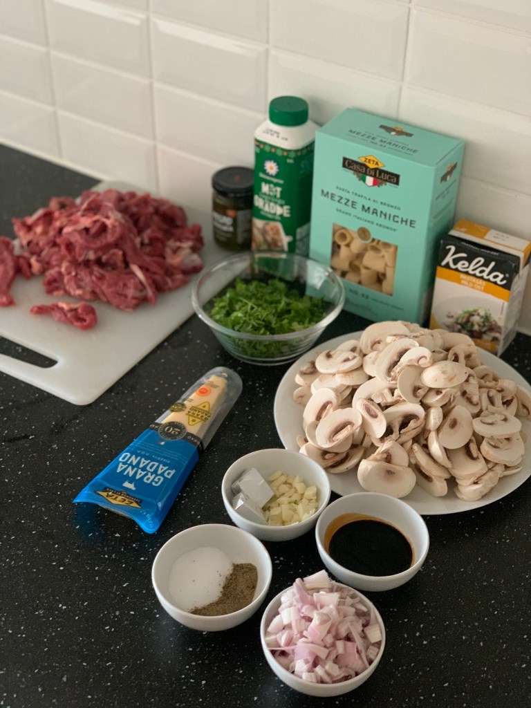 - I samma stekpanna som du har stekt köttet lägger du mer matfett och steker löken och champinjonerna tills de mjuknar och får färg. Finhacka vitlök och lägg i stekpannan, stek lite till.