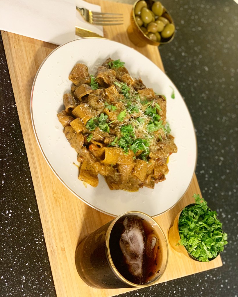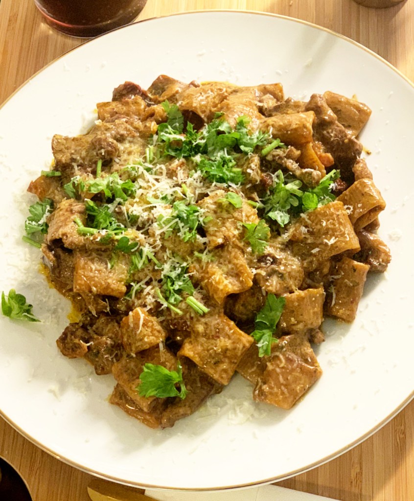- Lägg pastan i en kastrull och häll över kokt vatten. Tillsätt olja, pastakrydda, salt och peppar, När pastan är kokt häll it vattnet och blanda ned pastan i såsen. Låt sjuda på låg värme i ca 5 minuter. Servera pastan med riven parmesanost över och toppa med finhackad persilja.