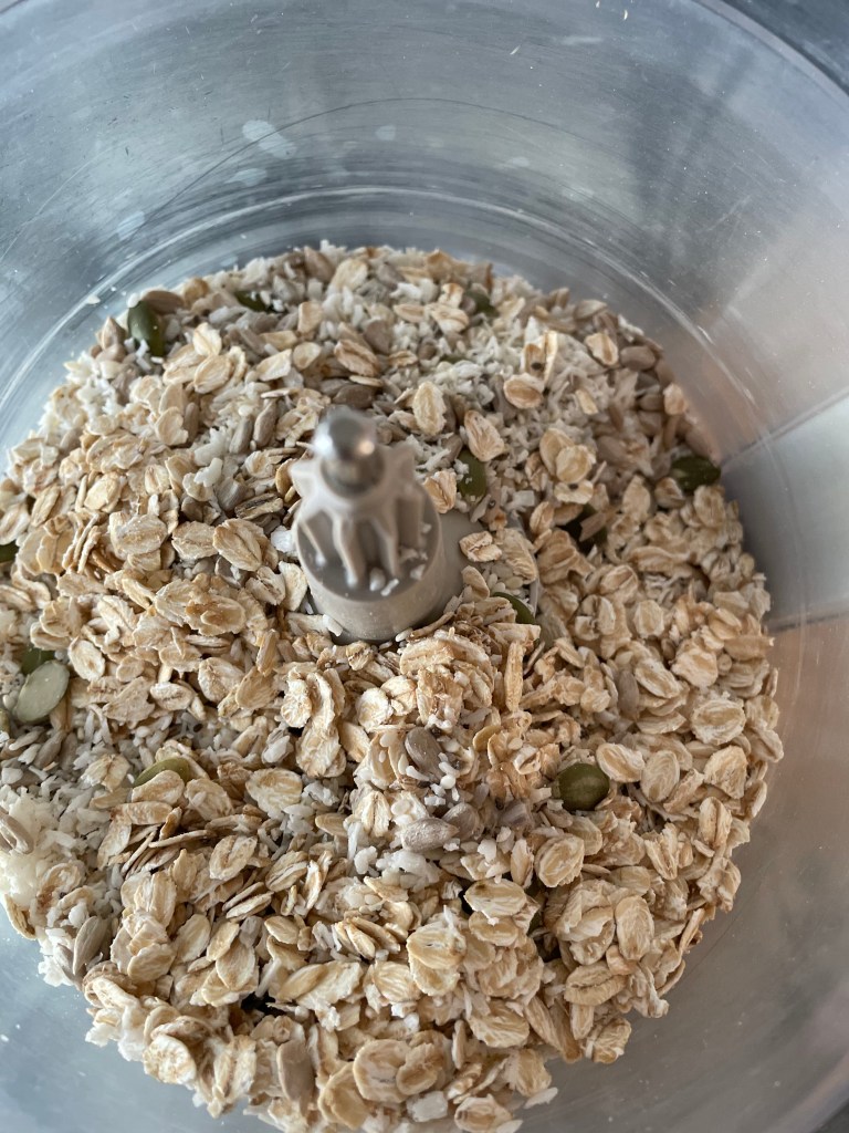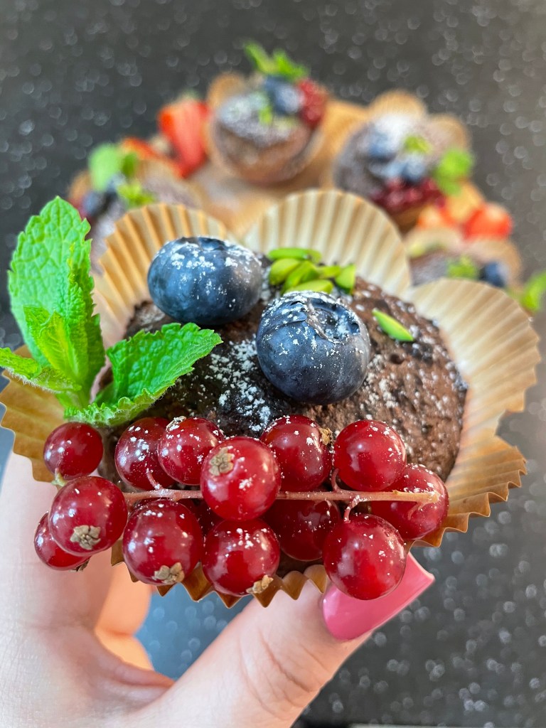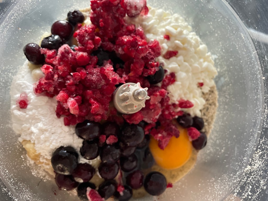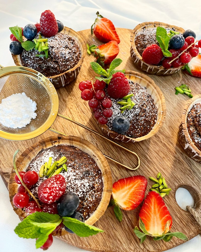Mossa banen med en gaffel. Mixa alla torra ingredienser; havregryn, sesam, solrosfrön, kokos, chiafrön och pumpafrön i en matberedare. Tillsätt övriga ingredienser och mixa ytterligare tills du får en jämn smet. Fördela i muffinsformar, fyll dem till 2/3, och grädda mitt i ugnen i 200 grader 15-25 minuter. Servera med färska bär och strö över florsocker (kan uteslutas).